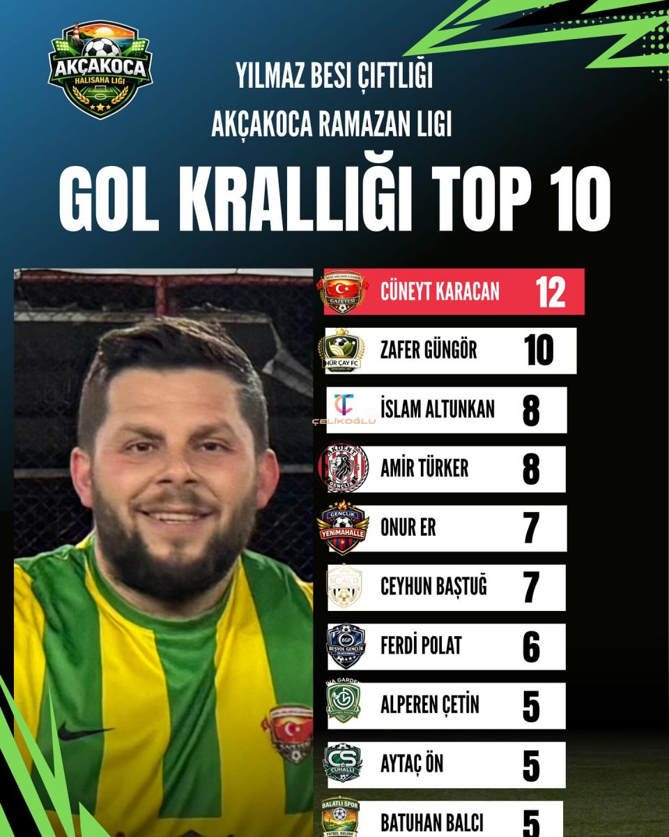 Yılmaz Besi Çiftliği Turnuvası’nda heyecan her geçen gün artarken, mücadelelerin centilmence ve yüksek tempoda devam etmesi sporseverler tarafından büyük beğeni topluyor. Yeni Akçakoca Haber ekibini ve gol krallığında zirvede yer alan Cüneyt Karacan’ı tebrik eder, turnuvada başarılarının devamını dileriz.